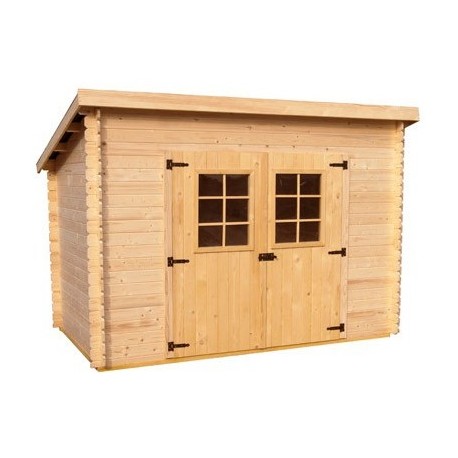 Das einschüssige Gartenhaus von 6,05m² in massiver Fichte 20mm dick hat eine breite Fassade von 3,04m mit einer Höhe von 2,01m. Auf der Rückseite fällt das Dach auf die Wand von 1,65 m ab, was sich aus einem Hang ergibt, der geneigt genug ist, um den Schnee durch die Schwerkraft natürlich zu entleeren, wenn er sich ansammelt.