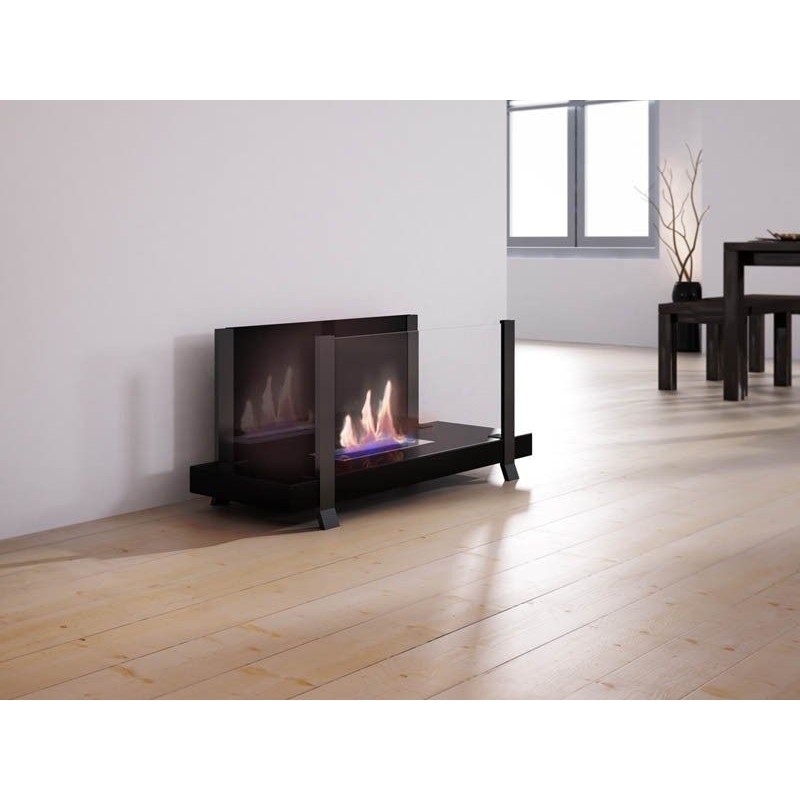 La chimenea está equipada con un plano horizontal en acero pintado (alta temperatura, negra), patas de acero pintado y 2 frentes de cristal templados (tipo de seguridad, de alta temperatura), 1 negro reflectante y 1 transparente.