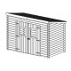El cobertizo de jardín de una sola pendiente de 6,05m² en abeto macizo de 20mm de espesor tiene una amplia fachada de 3,04m con una altura de 2,01m. En la parte posterior, el techo desciende sobre la pared de 1,65 m, que resulta de una pendiente lo suficientemente inclinada como para una evacuación natural de la nieve por gravedad cuando se acumula.