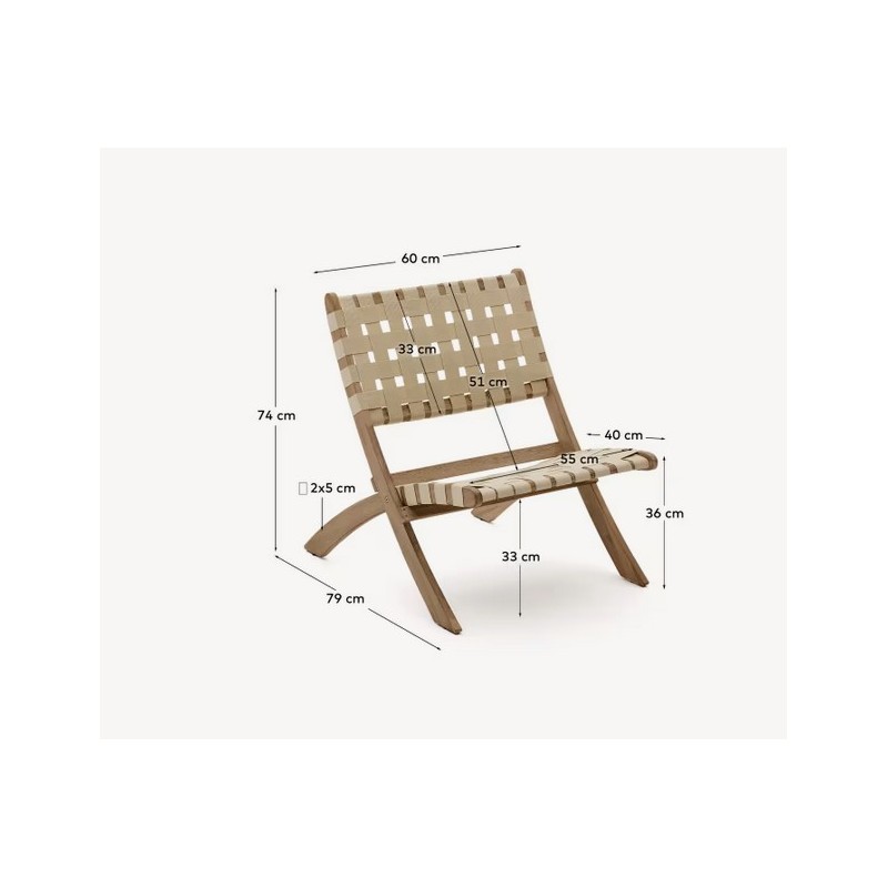 Sillón plegable en Madera de acacia maciza y cuerda crema FSC. Apto para uso en exteriores. Altura del asiento 36 cm.