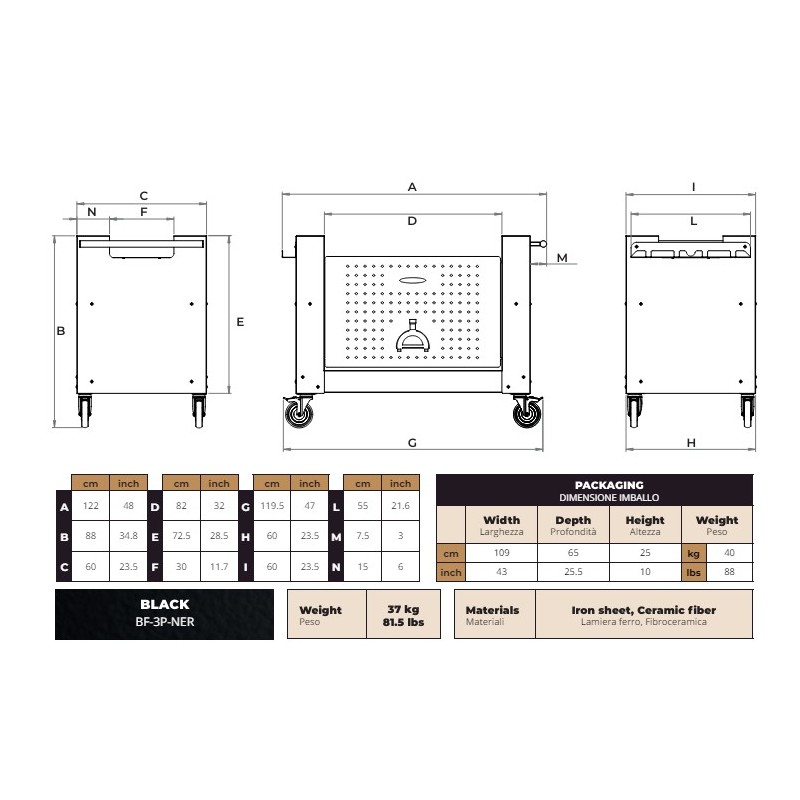 Base Chariot Alfa pour Four à Pizza Moderno 3 sur roulettes Noir