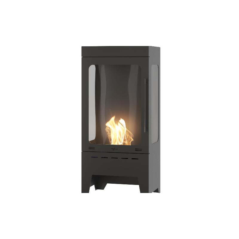 Le Poêle au bioethanol Incoza 3 avec 3 cotés vitrés et ses 4 pieds est autoportant.