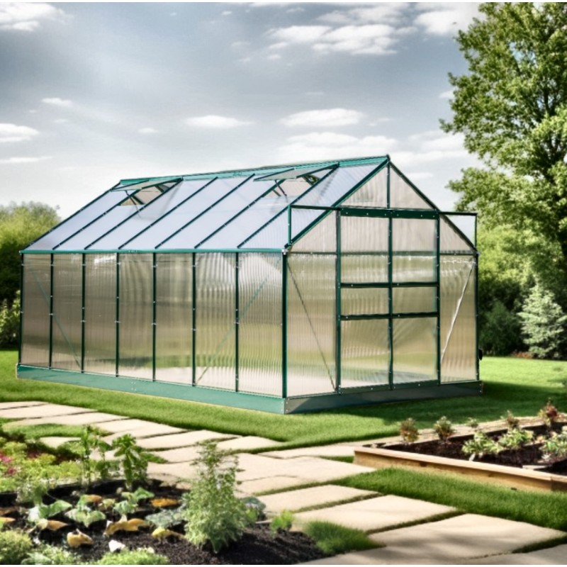 La serre de jardin est constituée d'une structure en aluminium anti-corrosion vert et de panneaux de polycarbonate 6 mm anti-UV et s'installent très facilement par la mise en place de clips qui s'insèrent dans la structure pour bloquer les panneaux.