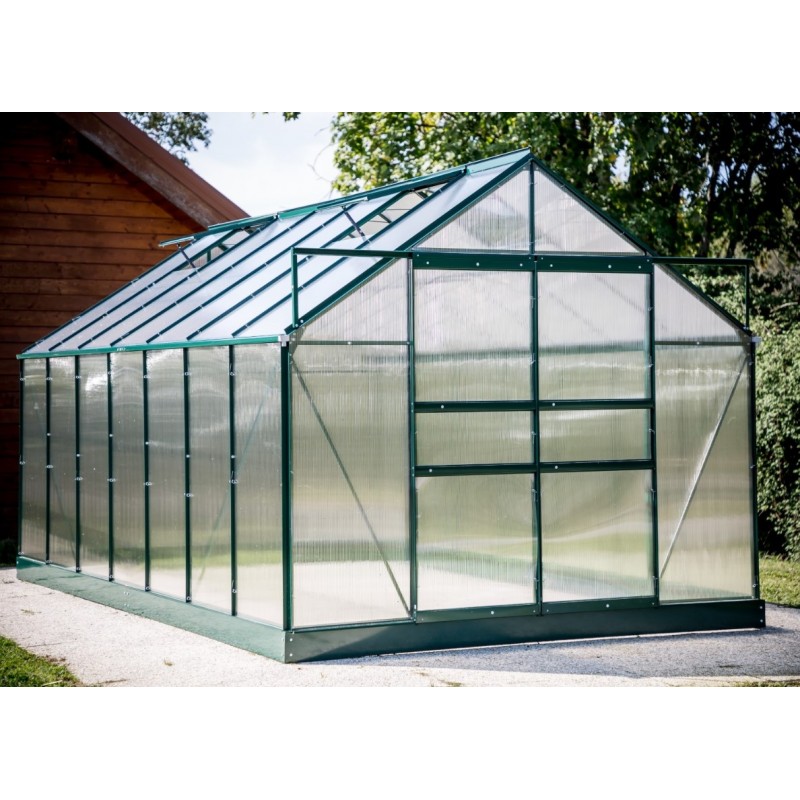 La serre mesure L244 x l425 x h223 cm avec une double porte coulissante et 4 fenêtres de toit.
