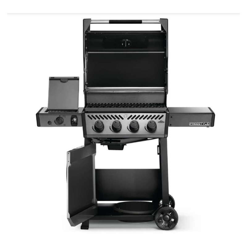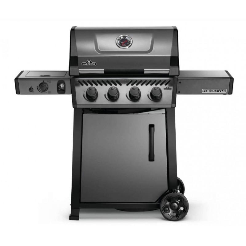 Il barbecue a gas Napoleone Freestyle 425 con 5 fuochi di cui 1 a gas propano laterale a infrarossi è un barbecue compatto con griglie in ghisa smaltata, a Accensione a getto e un ripiano laterale pieghevole, consente una cottura uniforme, facile e veloce.