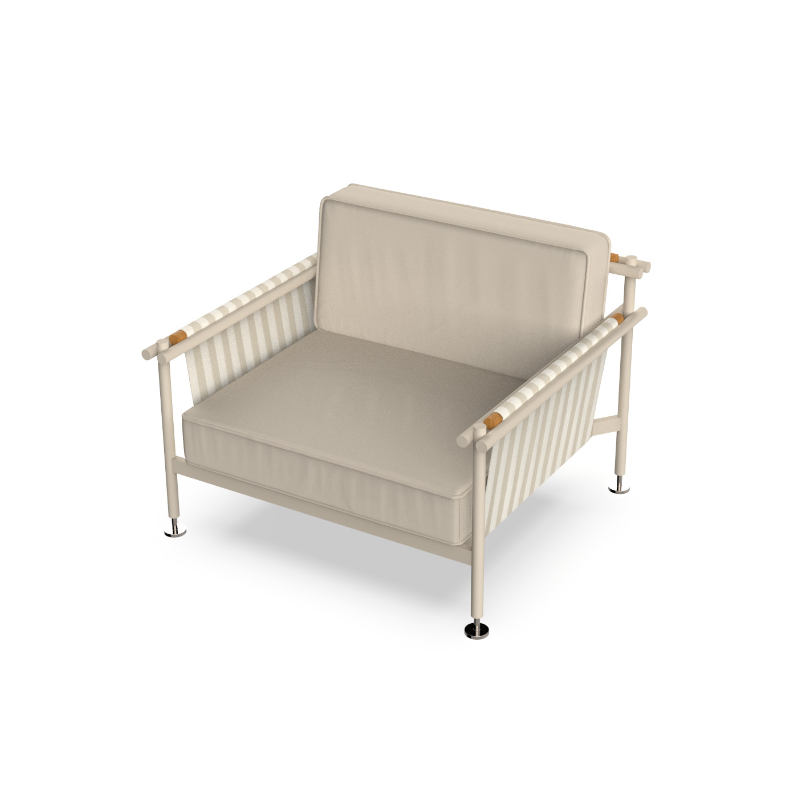 Ramón Esteve ha disegnato un'elegante poltrona lounge con una solida struttura in alluminio, dettagli in teak e gambe in alluminio lucido.