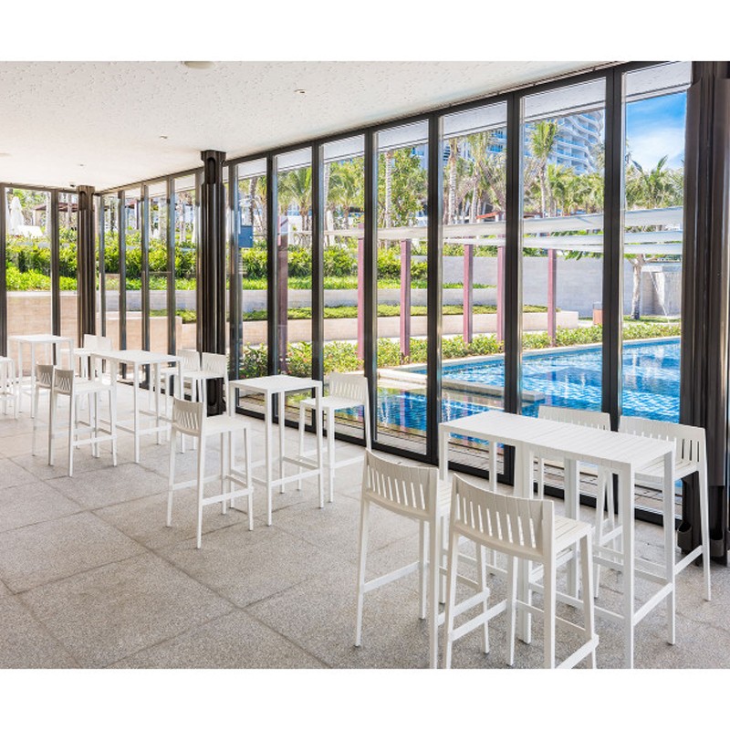 Composto da due sgabelli alti e un tavolo alto, il set da tavolo Spritz e due sgabelli ci ricordano le recinzioni in legno bianco che allineano la spiaggia.