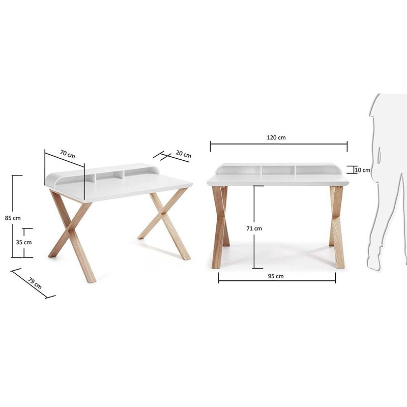 Scrivania di 120x79 cm con struttura in legno di frassino con pannello in fibra di legno laccato di colore bianco opaco.